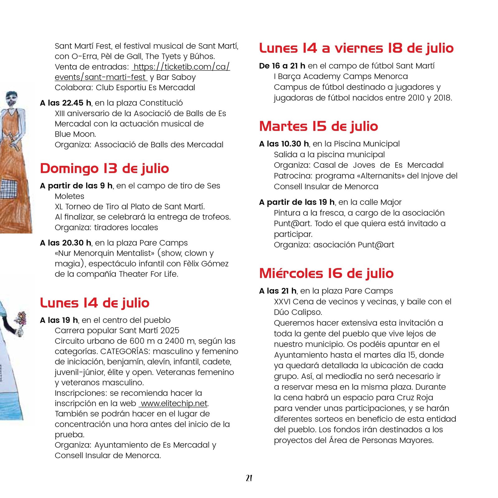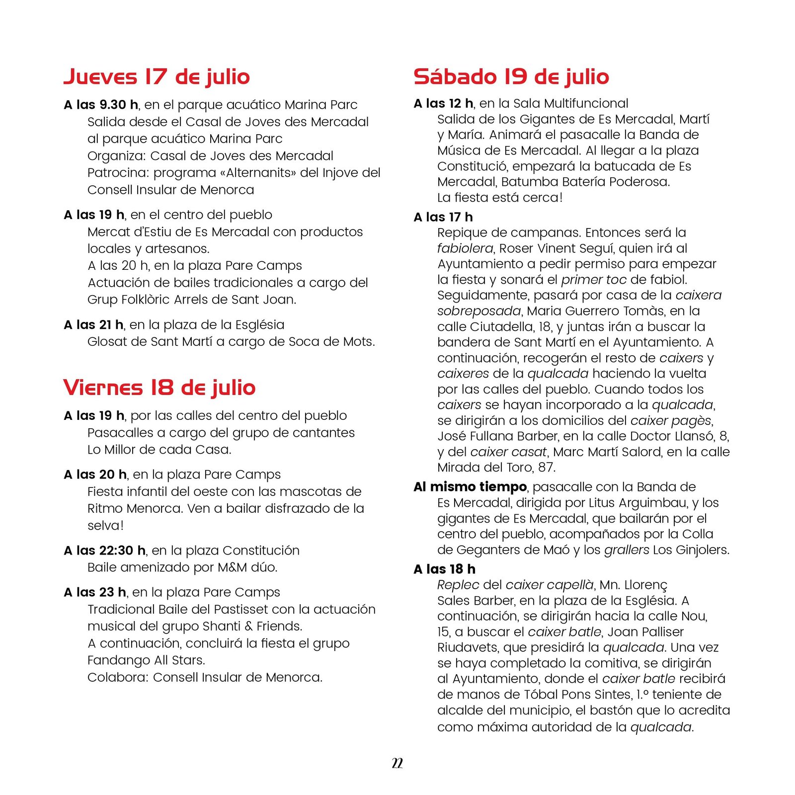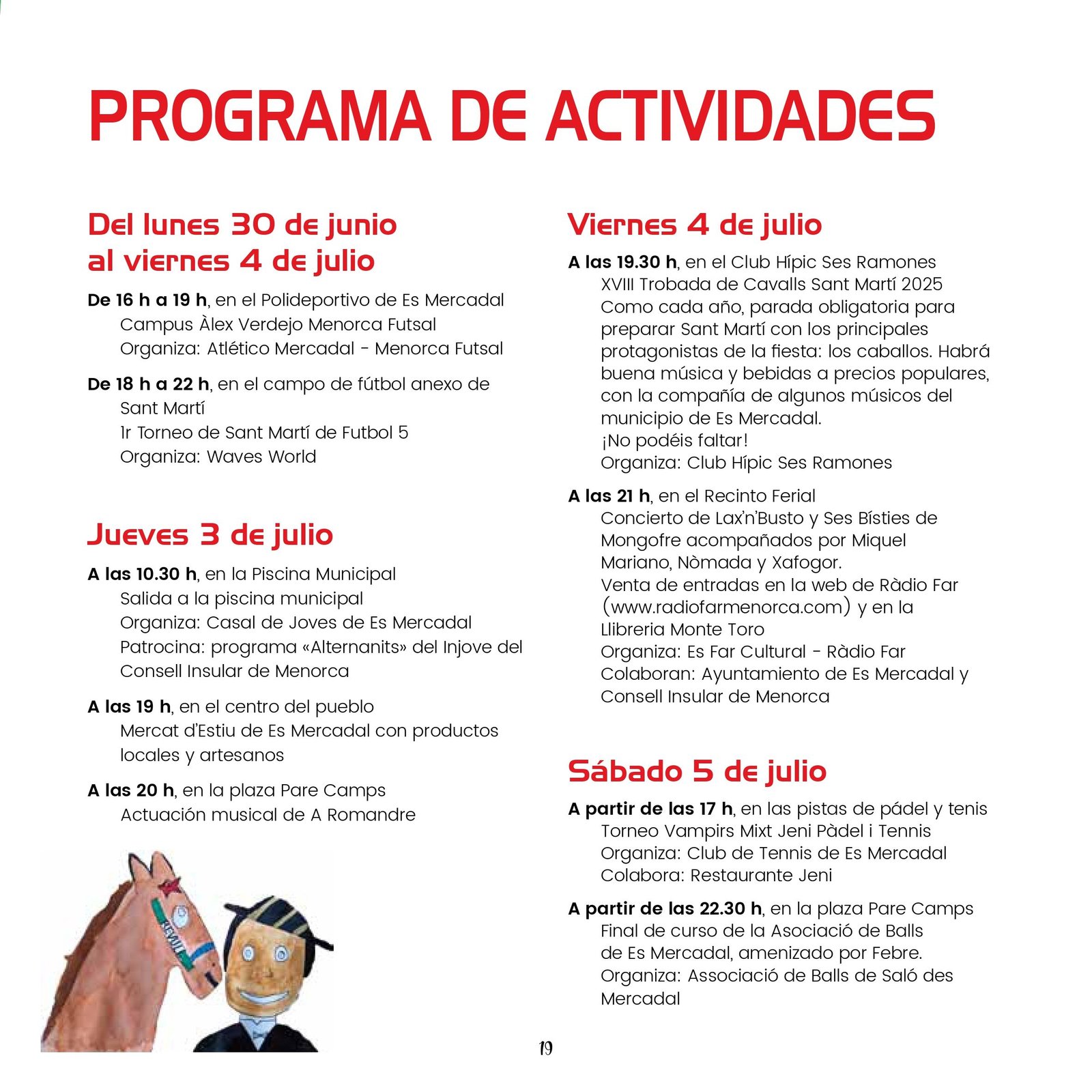 Los próximos días 19, 20 y 21 de julio se celebran las fiestas de Sant Martí en Es Mercadal. Comienzan con un variado programa de eventos culturales, deportivos y musicales que se desarrollan entre los días 30 de Junio y 21 de julio. Pueden consultarlo a continuación: