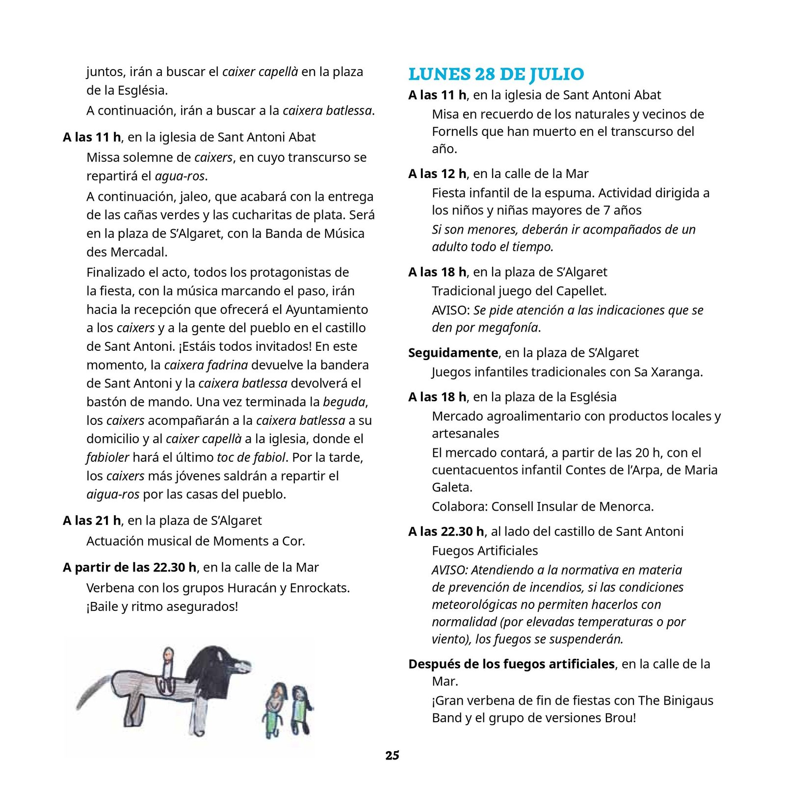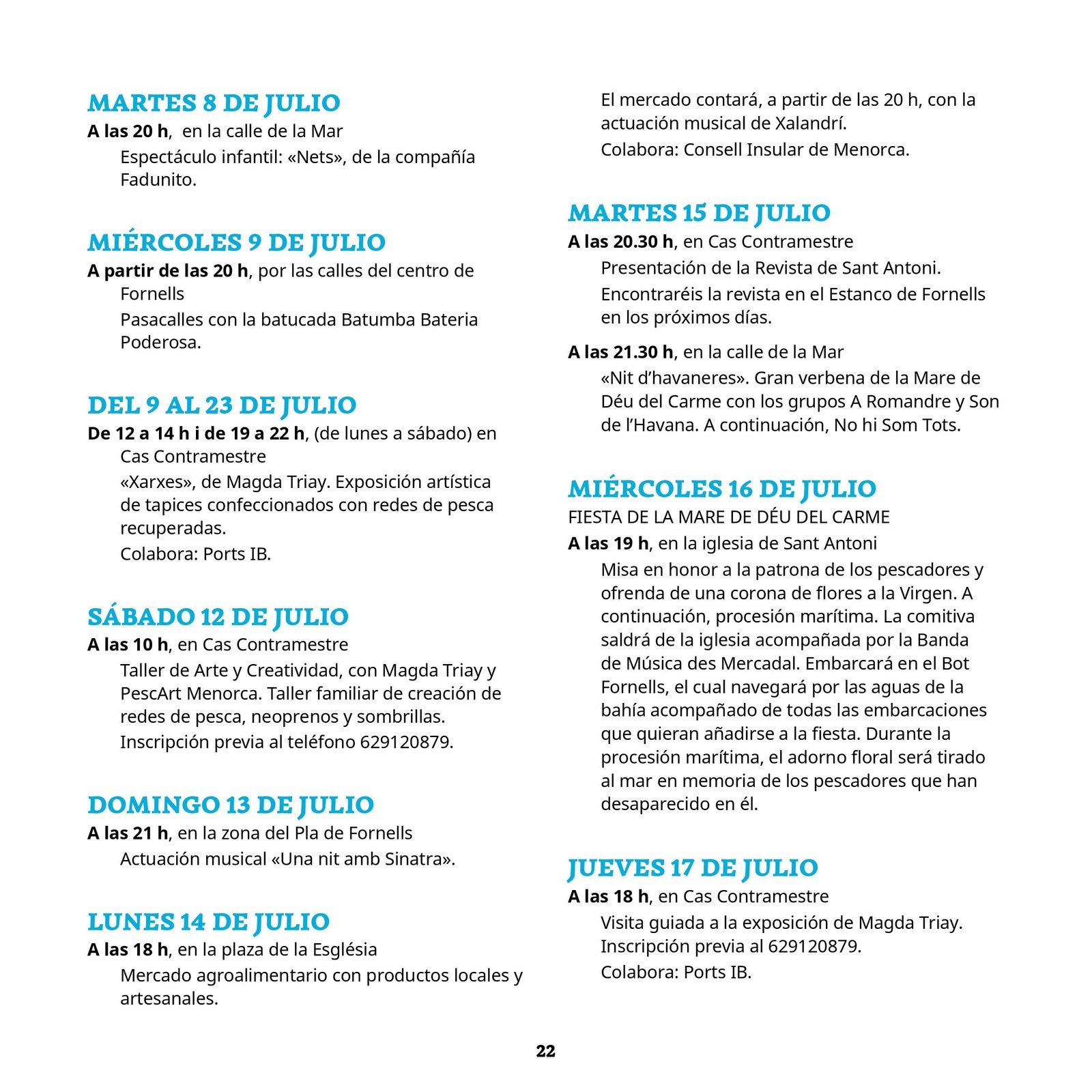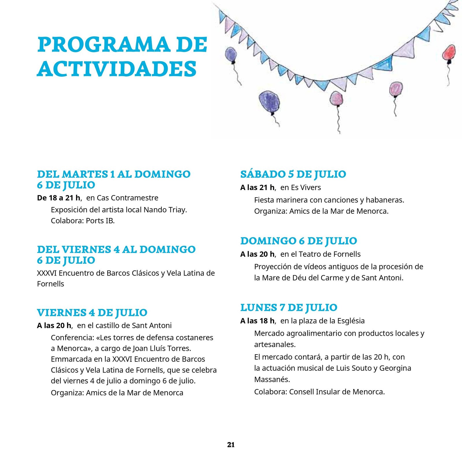 El cuarto fin de semana de Julio (los días 26, 27, 28) se celebran las fiestas patronales de Sant Antoni en Fornells. Aquí les presentamos un programa de fiestas repleto de actividades para toda la familia.