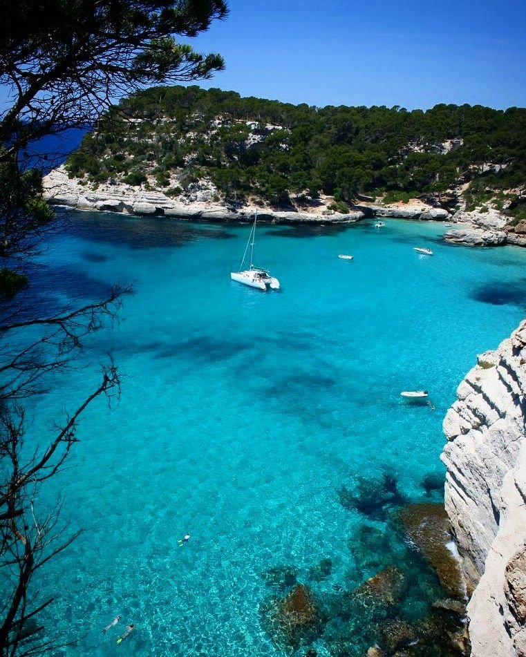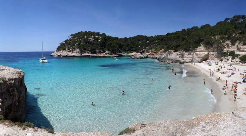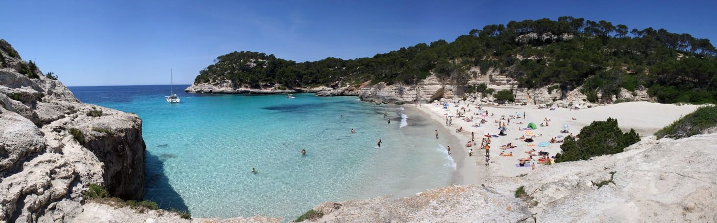 Cala Mitjana está rodeada por frondosas marinas repletas de pinos mediterráneos que bordean la playa, se trata de una playa de arena muy blanca y fina con unas aguas cristalinas de color azul turquesa espectaculares.