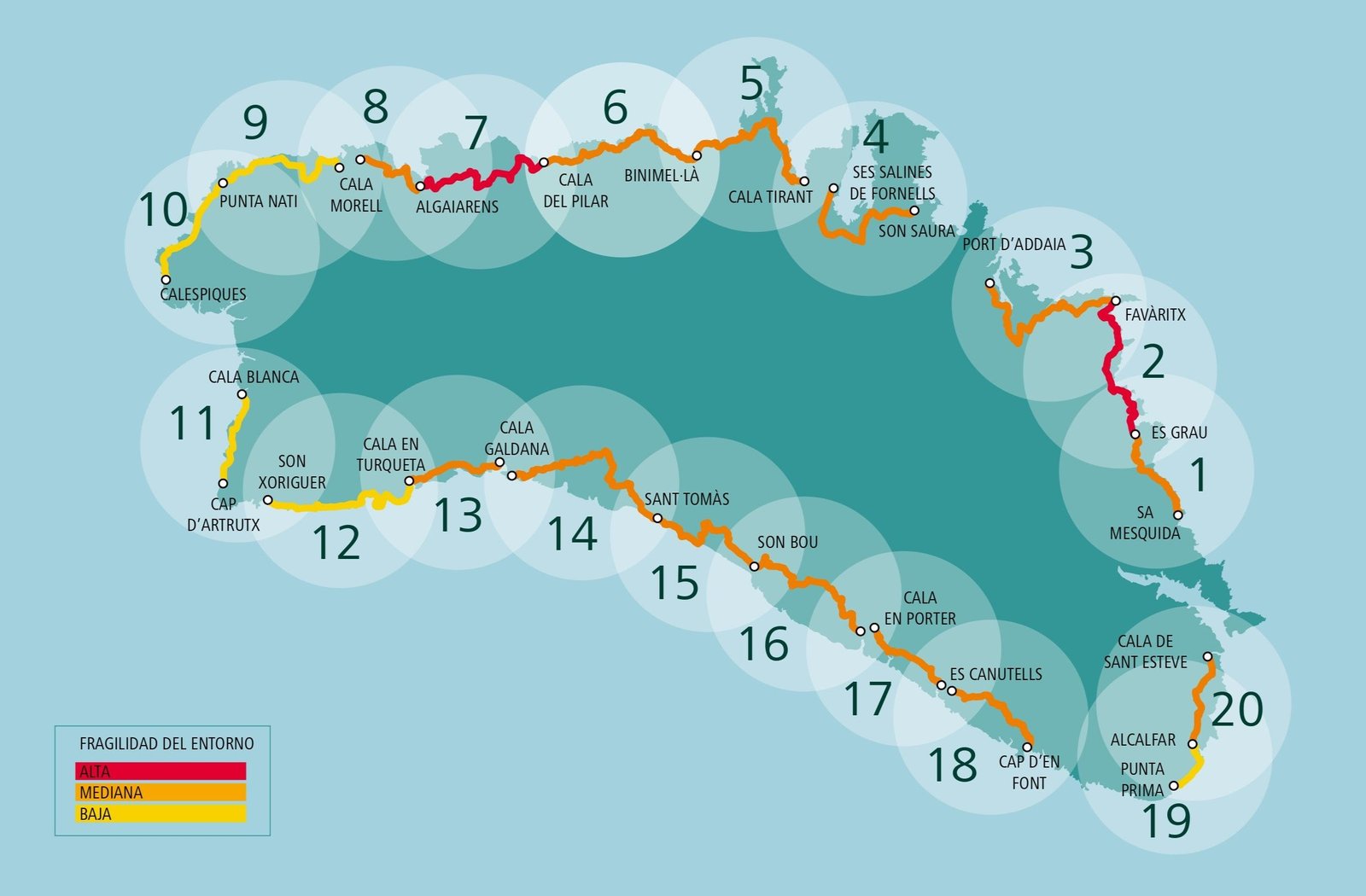 20 | Cala de Sant Esteve | Mahón | 2 h 20 min | 6 km | Fácil |